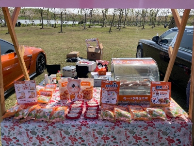 春日正当“食”,在后备箱集市上,爱森“肠”口鲜烤肠、爱森小酥肉、爱森大红肠、爱森五花大肉粽、爱森葱油拌面、纷纷亮相。后备箱集市包括茶点环节、热食环节、展示环节。在热食环节中,提供露营热食的多种选择与花式吃法。爱森烤肠,现烤现吃、买五送一,引来众多游客排队购买。