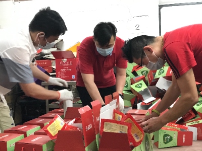 虽然仓库狭小闷热,但是大家分工协作,有条不紊地完成了叠盒、分装、打包等程序。经过3小时的奋战,共完成650份粽子礼盒。