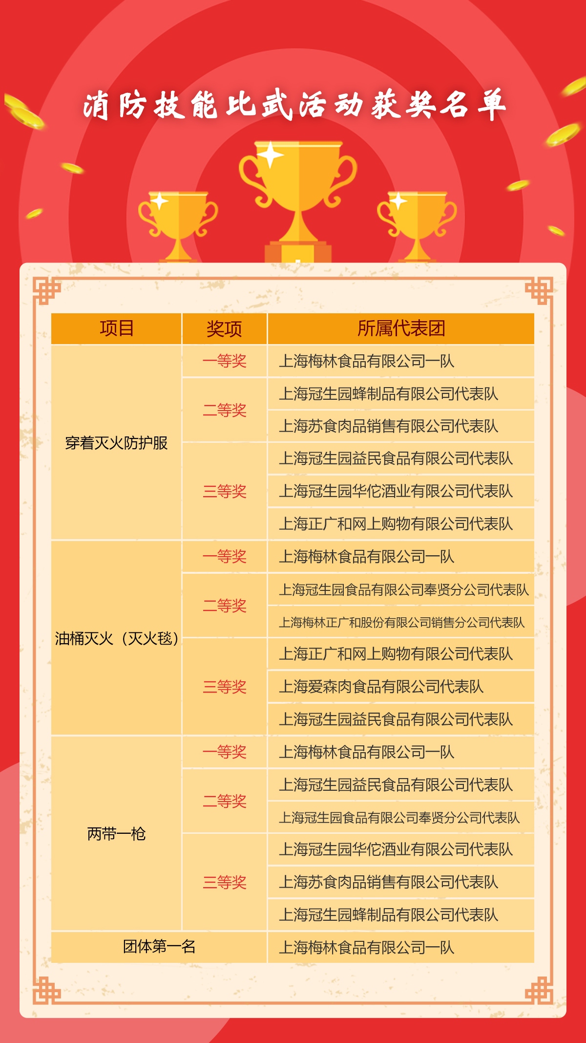 经过紧张激烈的角逐,上海梅林食品有限公司一队获得各单项一等奖,并荣获团体总分第一名。